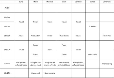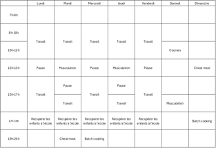 D’abord, on ne va pas se mentir, mais pour trouver du temps il va falloir le prendre et donc rogner sur une autre activité. Rogner, oui mais de combien ? Pour avoir un impact significatif, il faut environ 3 créneaux horaires par semaine. La première des choses est donc de sacraliser 3h par semaine répartis sur 3 jours différents. Par exemple, pour la pratique de la musculation, ça peut être une séance le mardi, le jeudi et le samedi. Pourquoi sacraliser ces 3 créneaux horaires ? Quand on prend un engagement on a plus de chance de s’y tenir. Que ça soit vous-même ou votre famille, quand le créneau est bloqué sur l’agenda, il faut se justifier pour le faire sauter. La flemme/fatigue n’est pas une excuse valable pour ne pas aller au sport. On ne peut pas faire tout le temps des performances olympiques, mais l’important c’est de faire la séance même quand on est moins bien. Il s’agit de 3h dans la semaine pour toi et toi seul, dans la frénésie et les sollicitations incessantes du monde actuel, il est très bénéfique pour soi même mais aussi pour son entourage d’avoir ces moments de pauses. A quel moment de la semaine placer ces 3h ? Et bien là, ça dépend de l’agenda et du rythme biologique de chacun, pour certains c’est le matin avant le boulot, pour d’autres c’est entre midi et deux, dans mon cas c’est lundi, mardi et jeudi de 19 à 20h. Le meilleur moment pour pratiquer du sport c’est quand son agenda le permet.